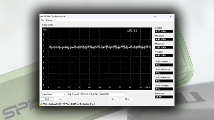 AIDA64 Disk Benchmark v4.70 записал (линейная запись) весь объем за 2 часа 32 минуты и 25 секунд (9145 секунды), а средняя скорость составила 6,5 МБ/с. Небыстро, но, что имеем – то имеем.