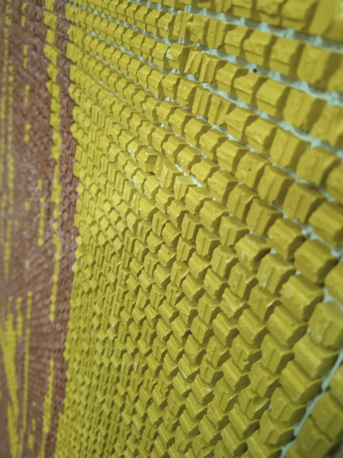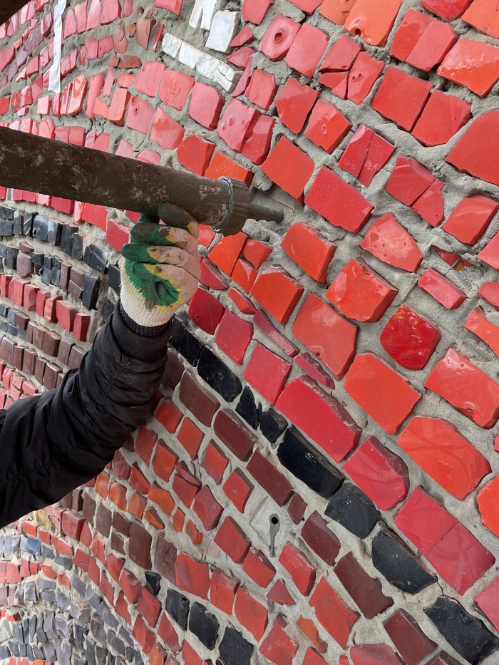На этом работы по консервации произведения были закончены и мы приступили к реконструкции утраченных эллементов. Скульптор из нашей команды восстановил элементы лепнины, в то время как остальные сотрудники укрепили и заделали трещины в несущей конструкции. После высыхания восстановленных элементов лепнины и трещин, художники-мозаичисты восстановили утраченные фрагменты керамической мозаики в стиле и технике автора.