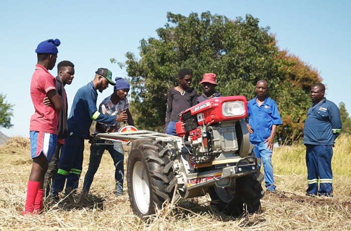 А это местные работяги смотрят на образец сельскохозяйственной техники, подаренной Таиландом.