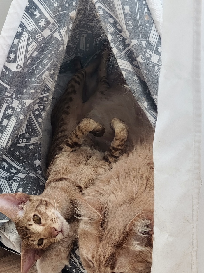 Я забрала её с улицы около года назад. Ириска постепенно училась доверять человеку, и сейчас уже сама подходит гладиться😻, очень любит играться с игрушками и тапочками😅 и спит в ногах у человека