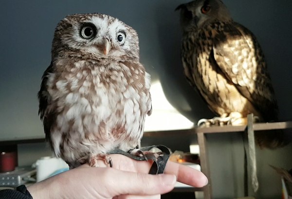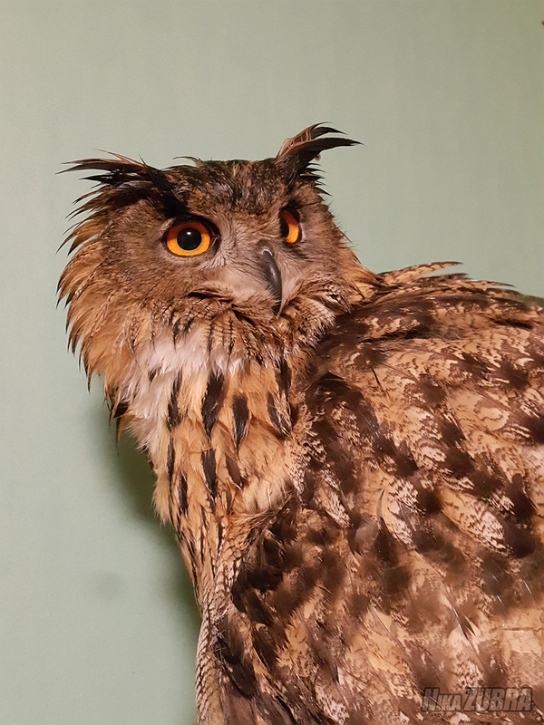 Юй ночью очень сильно перепачкалась в крови своего ужина. Заляпала все лапы, клюв и перья на пузике. Домовые сычи сами никогда не купаются, в природе они чистят перья, валяясь в пыли и песке, а дома обычно не пачкаются.