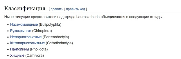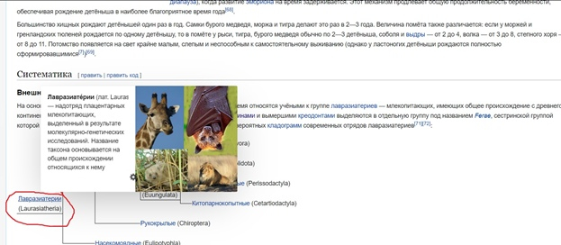В разделе нам нужно узнать отношение приматов к этому надотряду. Для этого мы переходим во вкладку «классификация» и как ни странно мы не обнаруживаем в нём приматов (рис.5) Получается, что медведи по версии википедии вообще не близкие родственники приматов. Может это так и есть, но кто же по версии википедии примату будет братом?