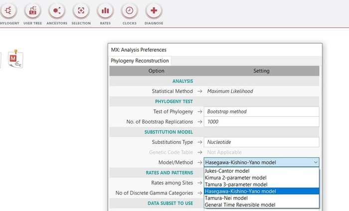 Далее производим установление попарных эволюционных дистанций между анализируемыми последовательностями, представляемых в виде матрицы дистанций. Другими словами, для построения дерева нам требуется эволюционная модель, оптимального метода расчета эволюционных дистанций между последовательностями. В качестве статистического метода я воспользуюсь методом оценки дат дивергенции видов, который разрабатывался с точки зрения концепции молекулярных часов, а именно эволюционной моделью Hasegawa, Kishino и Yano 1985 года.