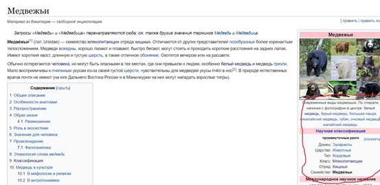В качестве гипотезы можно опираться на ваши знания в области классификации групп животных. Однако, если у Вас нет таких знаний и Вы не хотите страдать в поисках этих знаний в полях, лесах и лабораториях, то Вы можете стать продвинутым пользователем интернета и воспользоваться удобном сайтом lifemap [1], который отображает филогенетическое древо всех животных. Если же вы не продвинутый пользователь, то Вы можете просто воспользоваться википедией. Стоит отметить, что для учёного сайт Lifemap является таким же примитивным, как и википедия, но не бойтесь начать с малого, ведь википедия может послужить толчком к эволюции от простого к сложному. Поэтому пойдёмте эволюционировать на вики вместе. Для этого зайдём в поисковик и посмотрим информацию о нужных нам группах, с которыми в будущем нам предстоит работать, на данном сайте. Первые в списке у нас медвежьи. На странице сайта нам не нужно досконально изучать строение, размножение и образ жизни медведей. Нам нужны три вещи: