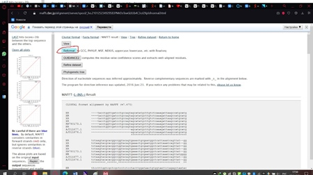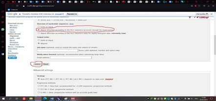 Сохранённый файл мы загружаем на сервер мафта в браузере (рис. 11) и изменим один стандартный параметр, выбрав тот, который показан на рисунке 12. Далее нажимаем кнопку «Submit» и получаем результат, который необходимо реформировать в формат fasta, как показано на рисунке 13.