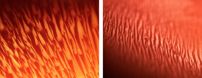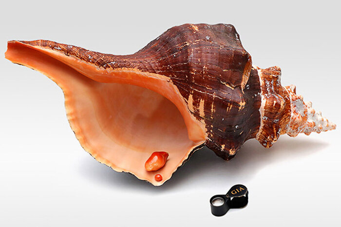Но ещё более уникально в триплофузусе то, что он может производить жемчуг, который обычно добывается в двустворчатых моллюсках. Его жемчужины имеют редкие оттенки – оранжевые, лососевые, розовые. Посмотрите, как необычно смотрится структура таких жемчужин примерно в пятнадцатикратном увеличении.