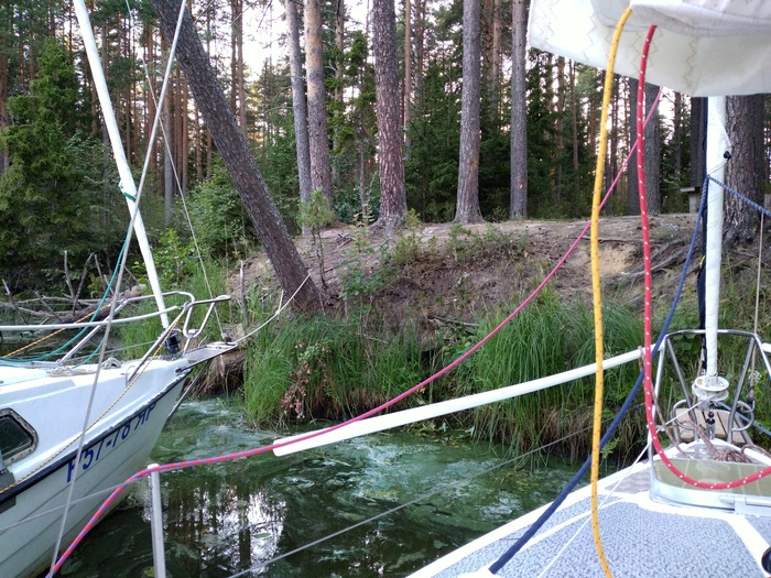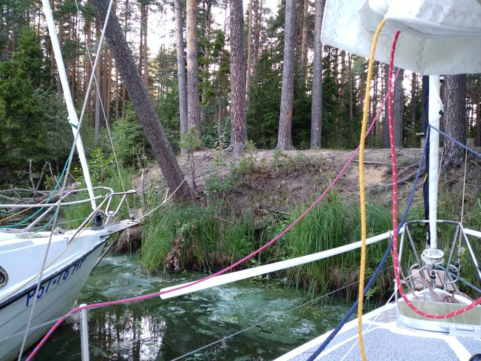 После сытного обеда, совмещенного с ужином (салат из огурцов и помидоров, макароны с копченым мясом и чай), наступило время отдыха. Тишина, хорошая книга, красивые виды - идеально)) На ночь я ошвартовался у причала глемпинга "Ветрено" - не люблю, когда ночью крутит на якоре, от этого сон тревожный, а Алексей остался на месте.
