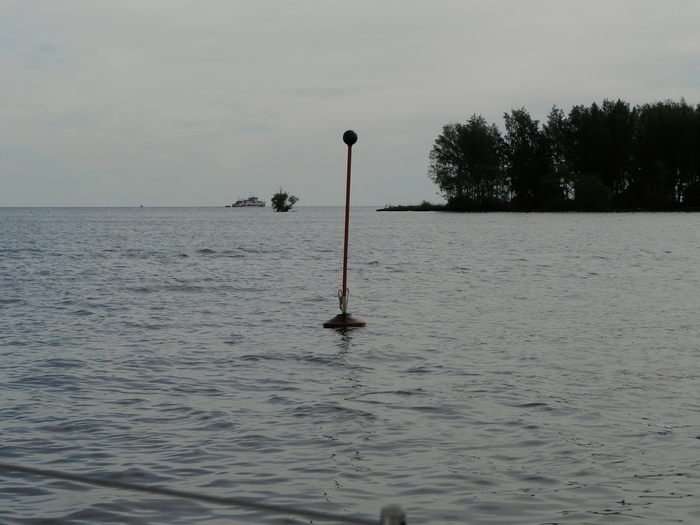 Интересной особенностью является "Судоходная обстановка". Здесь она выполнена в виде бревен, воткнутых в дно по краям фарватера. Некоторые из них уже наклонились и заметить их удавалось лишь благодаря чайкам.