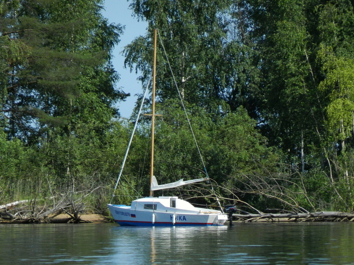 Проходя мимо островов напротив Первомайки, увидели стоящую на якоре яхту, явно самодельную. Номера ярославские. Интересно, откуда эти ребята?
