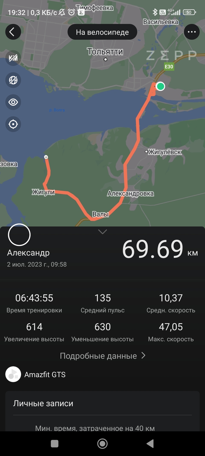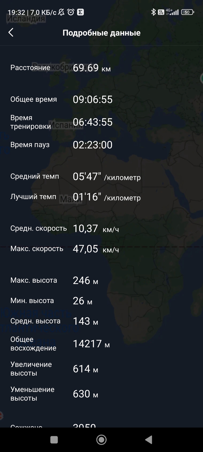 Конечная точка совпадает с начальной, останавливаем запись маршрута и смотрим сколько у нас получилось...