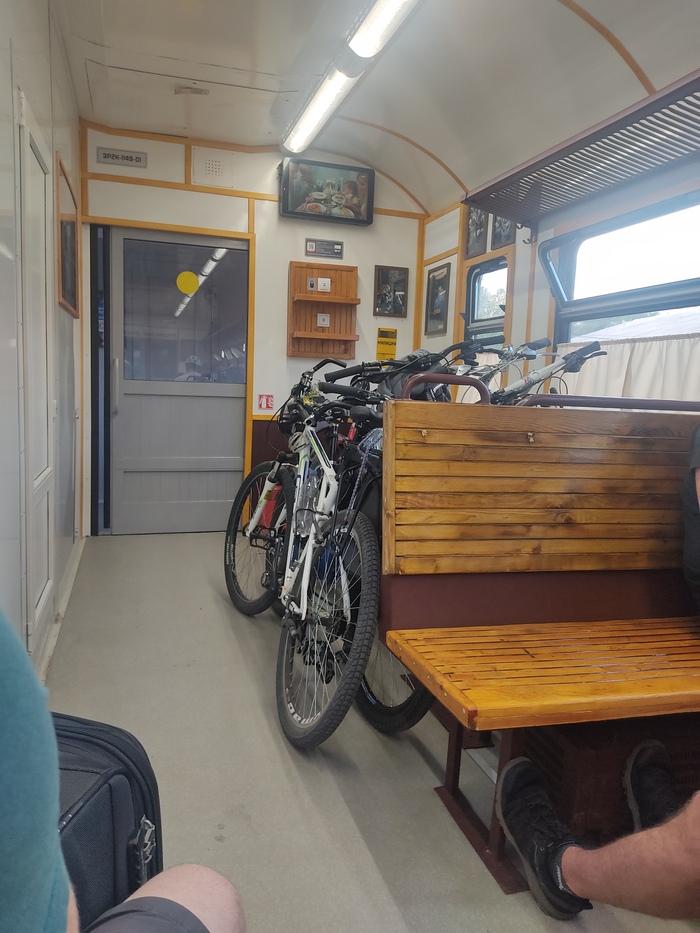 На обратном пути вместо "Ласточки" мы попали на ретро состав "Грушинский экспресс" так как дата нашей поездки выпала с юбилеем фестиваля Грушина. Несмотря на это место было даже для велосипедов.