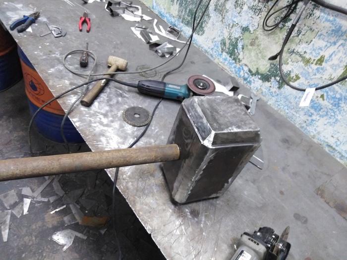 В роли ручки молота используется какая то труба со свалки диаметром 42 мм. и толщиной стенки 3 мм. Почему 40? Потому что она будет обмотана кожей, которая добавит недостающую толщину. На конце ручки будет резьба для наболдажника с отверстием для ремешка. Но для реализации этой части проекта нужно сначала откачать пьяного токаря, потому что в токарочку я пока не могу. Соберу полностью, покажу что получилось. За одно и основные ТТХ будут понятны (скорость вращения вокруг своей оси, вес для достойного и прочее..)