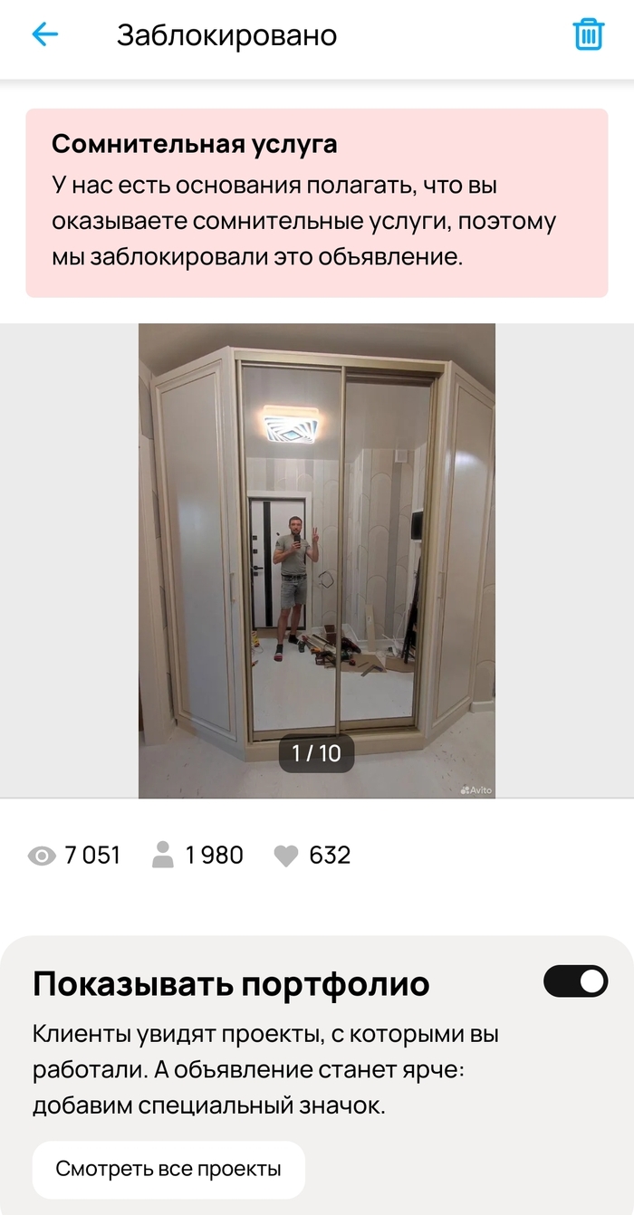 Но и это не всё! Самое главное — мне заблокировали ВОЗМОЖНОСТЬ создавать новые объявления в сфере «мастер на час».
