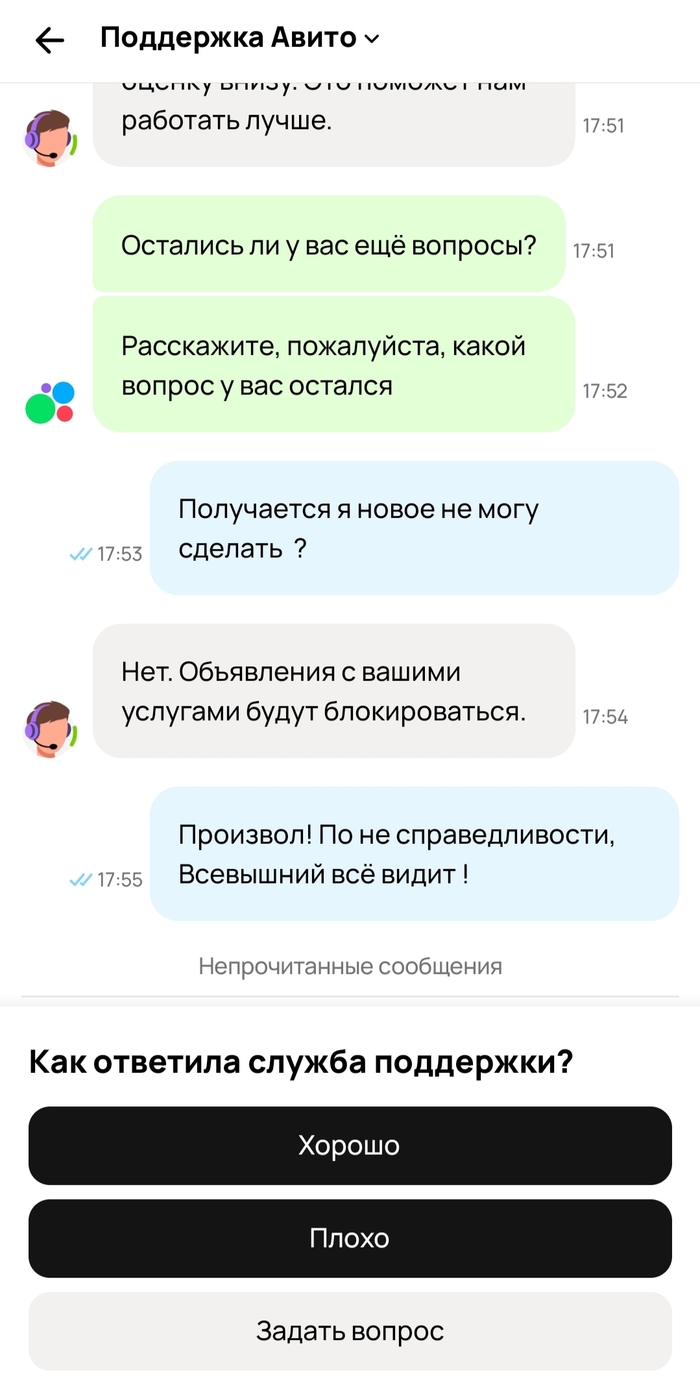 На следующий день — БАМ! Окончательная блокировка объявления. Причина: «предложение сомнительных услуг». Каких? Доказательств мне не предоставили. А у меня, между прочим, есть все скриншоты переписки. Но чат с той «клиенткой» удалён, а поддержка заявляет, что «вернуть его не может».