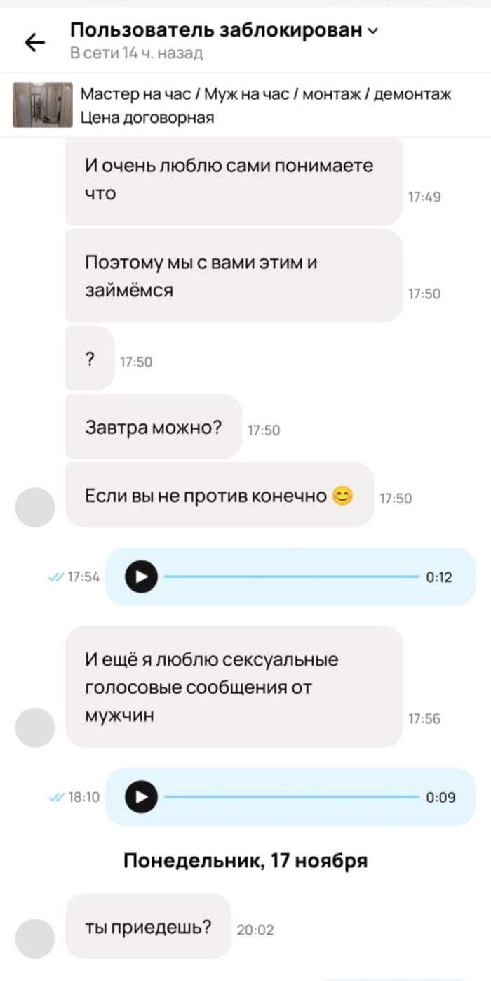 В ноябре 2025 мне, как и много раз за эти годы, в личку написали с «сомнительным» предложением. Типа «помоги, девочка течёт, трубу пробить нужно» или «приезжай на массаж». Я такие сообщения всегда игнорировал. Но в тот раз, чувствуя подвох (внутреннее чутьё шептало, что это конкуренты провоцируют), я решил поддаться на провокацию. Я в этот вечер был с любимой и решили вывести «клиента» на чистую воду, получить контакты и разобраться (Сочи город маленький). Я не предлагал услуг, не матерился, просто вёл странную переписку.