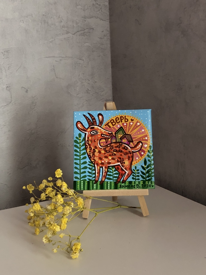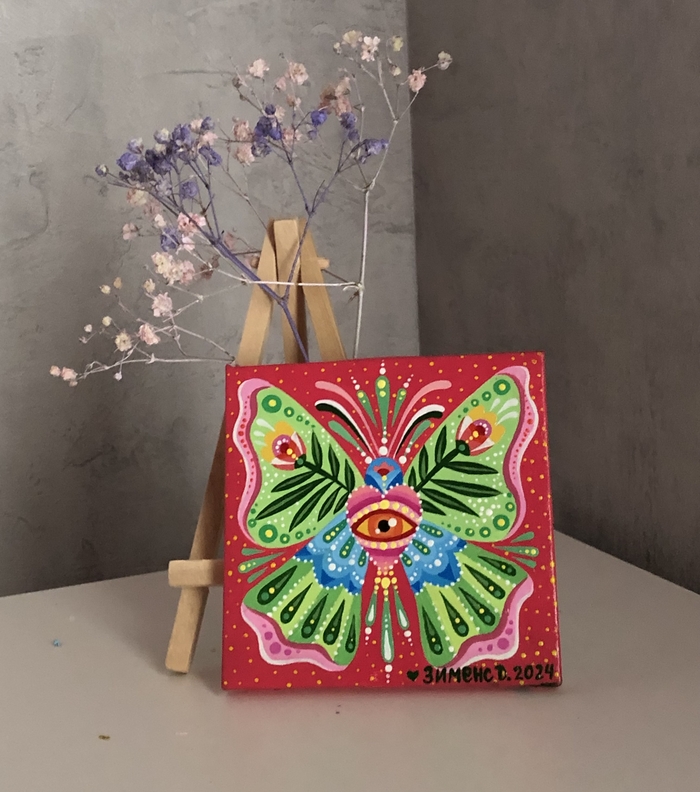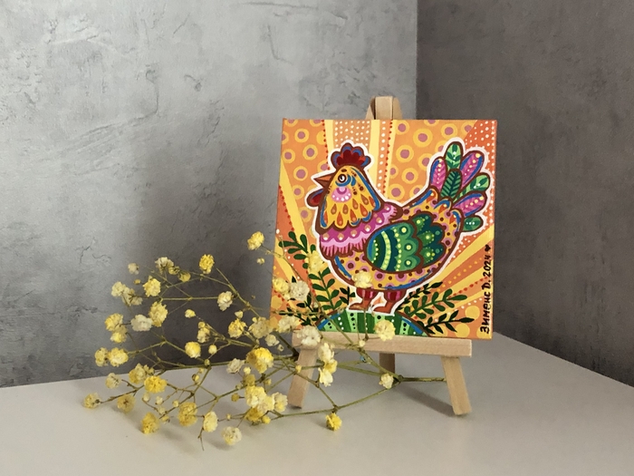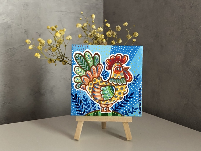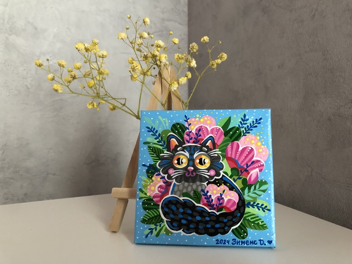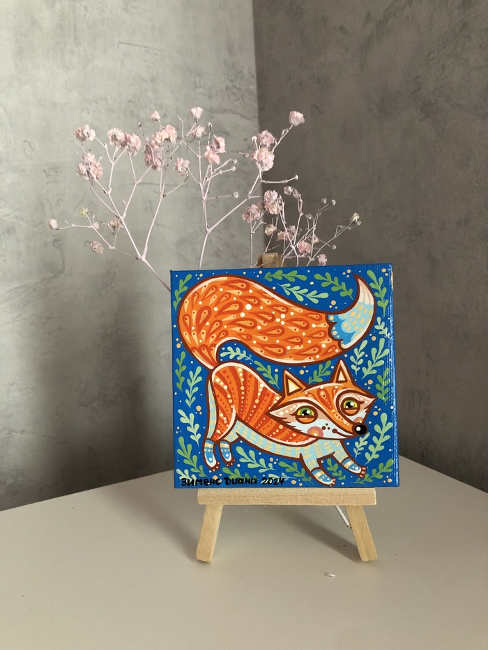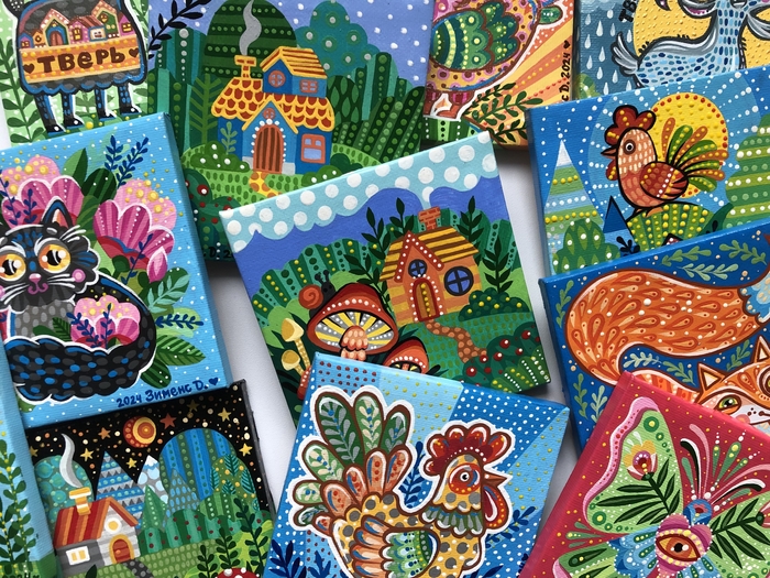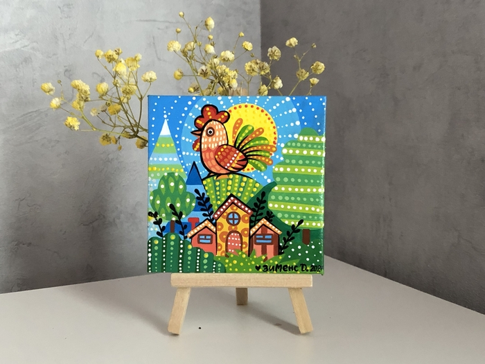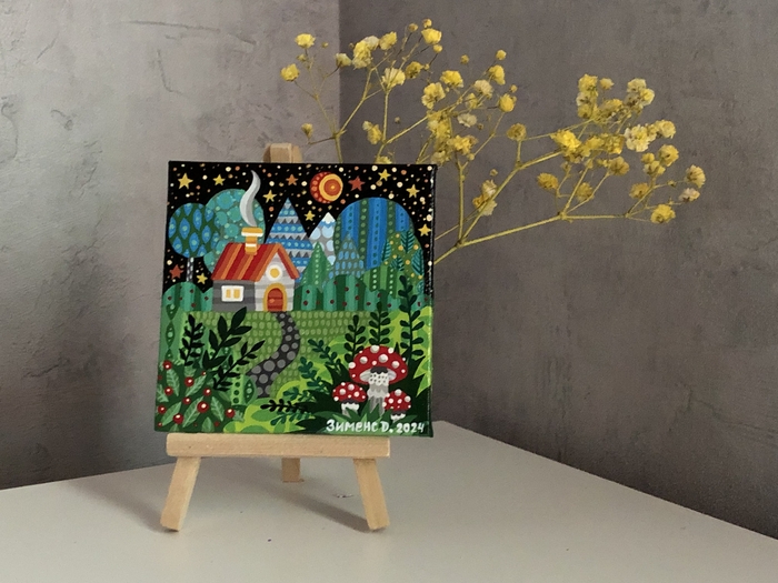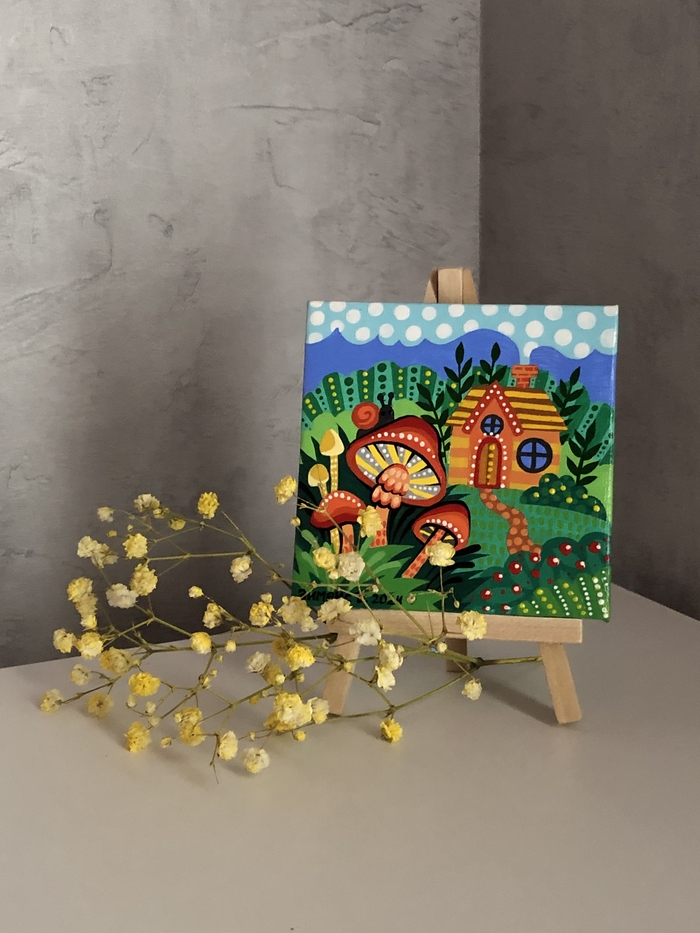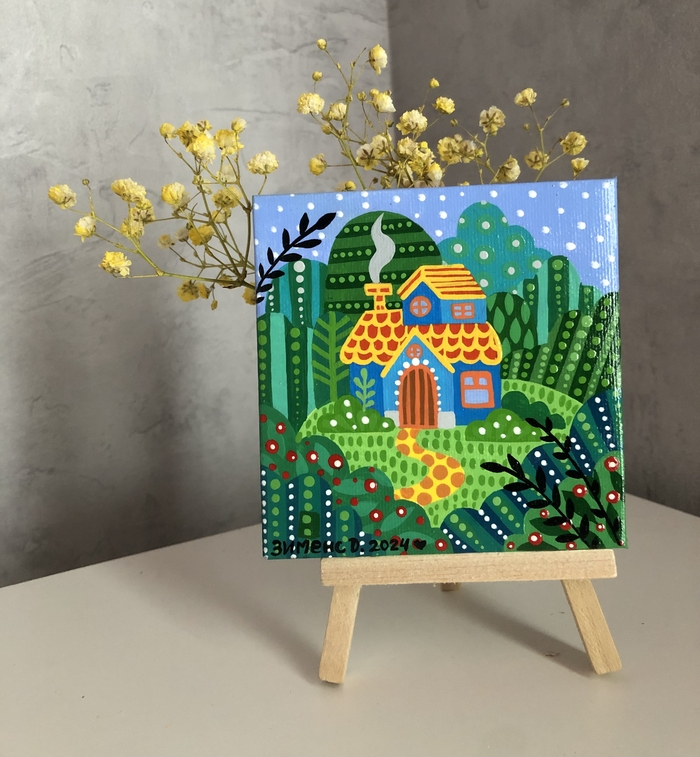 В последнее время я увлеклась вот такими маленькими картинками на холстах 10х10 см. К каждому холсту ещё прилагается маленький деревянный мольберт.