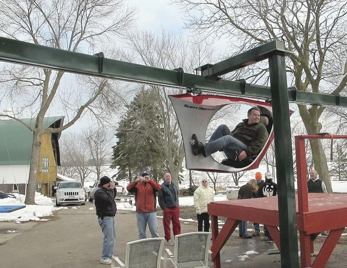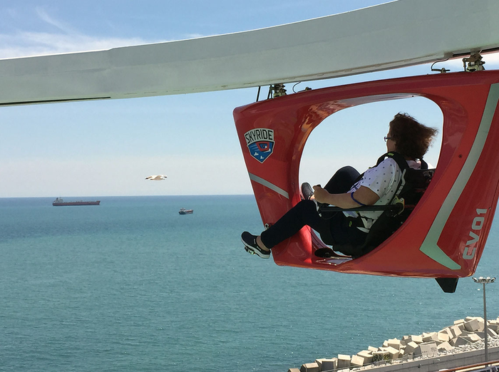 Skyride - это монорельсовая система с педальным приводом, которая была впервые задумана Скоттом Олсоном, тем же человеком, которому приписывают создание роликовых коньков.