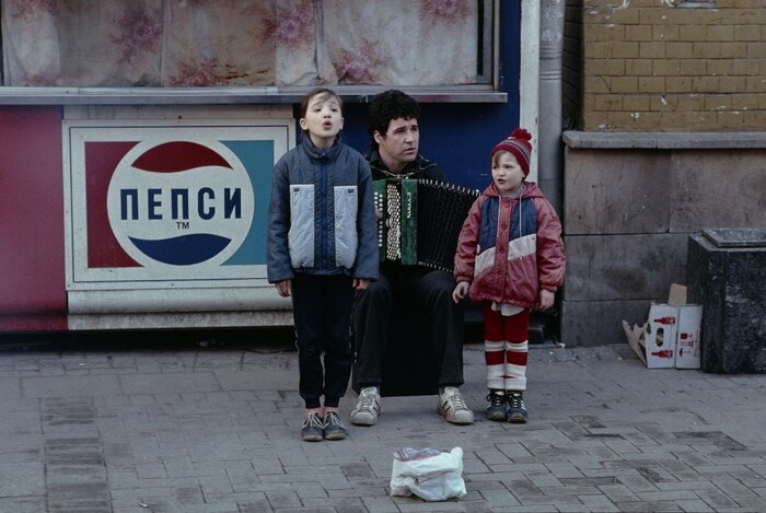 Отец играет на аккордеоне, пока его дети поют за деньги, выступая на улице.