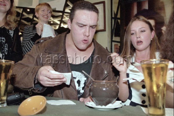 28 августа 1996 года, независимая ассоциация ньюсмейкеров России и клуб "Репортер" провели финальный тур всероссийского конкурса "Новый русский-96". Участниками конкурса стали представители ведущих российских фирм из самых разных сфер деятельности. На снимке: в конкурсе по поеданию пельменей принял участие президент российско-германского предприятия водолазных работ "Чудское озеро" Александр Невский.