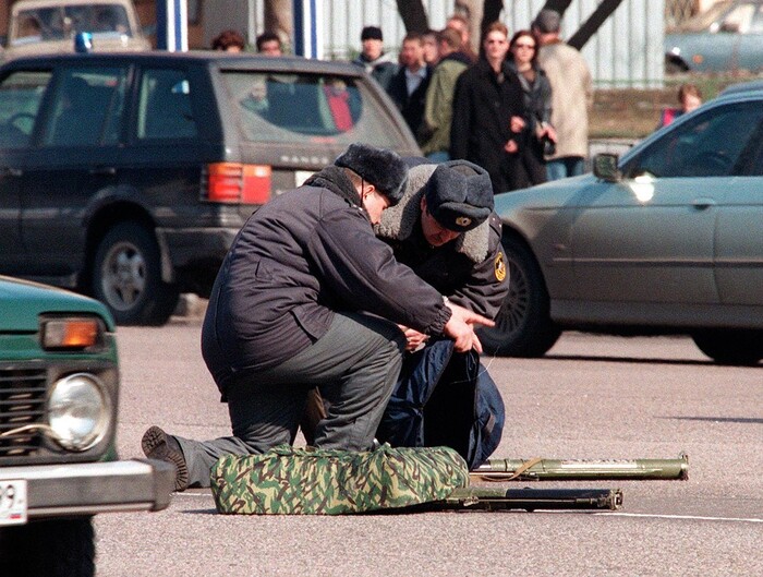 Сотрудники милиции осматривают два гранатомета перед посольством США в Москве, 28 Марта 1999 года.