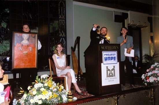 Британский аукционный дом "Сотбис" проводит в гостинице "Метрополь" в Москве благотворительный аукцион современной русской живописи и графики. Весь сбор будет перечислен ожоговому центру 9-й московской детской больницы, 1995 год.
