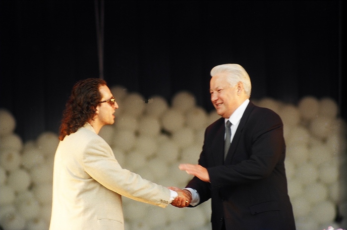 Дмитрий Нагиев и Борис Ельцин во время митинга на Дворцовой площади.