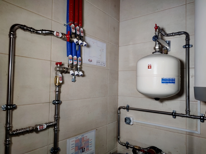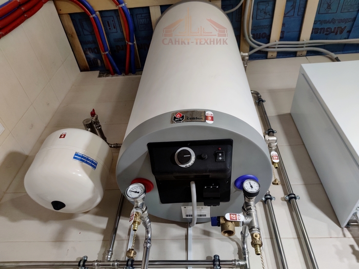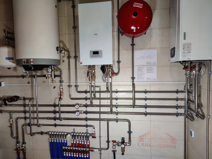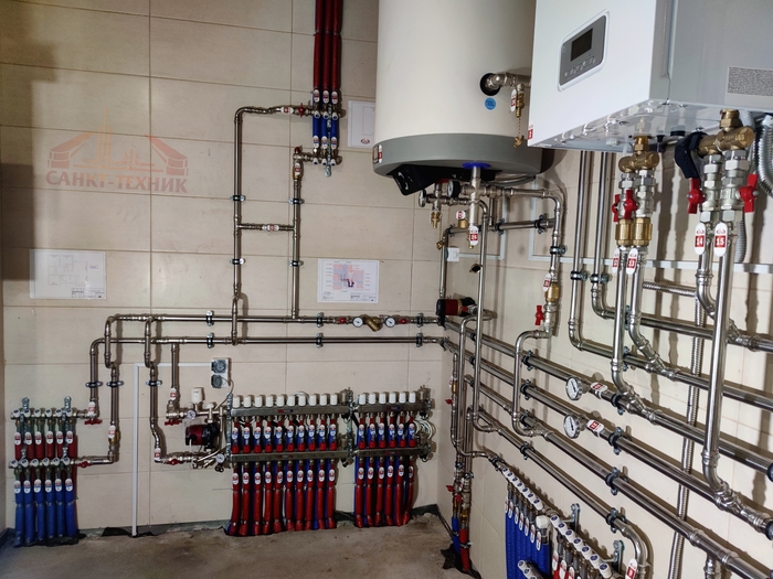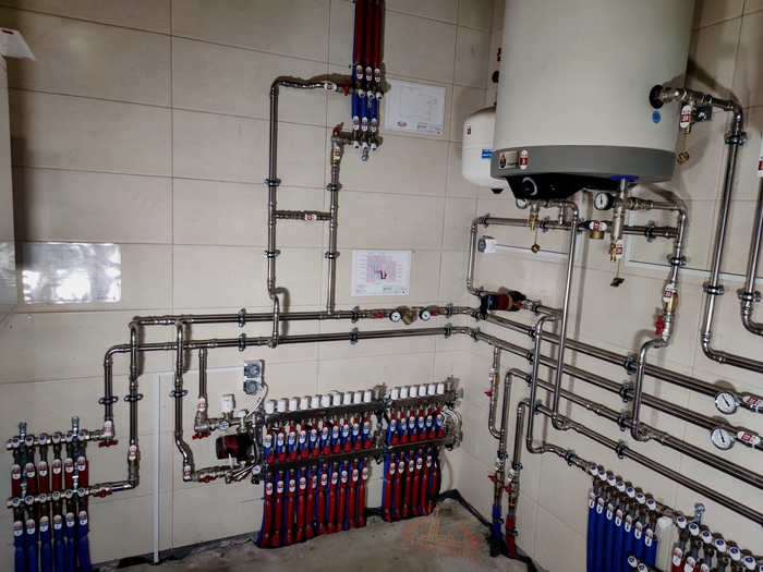 В итоге, котельная получилась супер-стандартно-надежной для частного дома на северо-западе России: два котла(электрический и газовый) + теплые полы + радиаторы + бойлер аж косвенного нагрева = 🔥