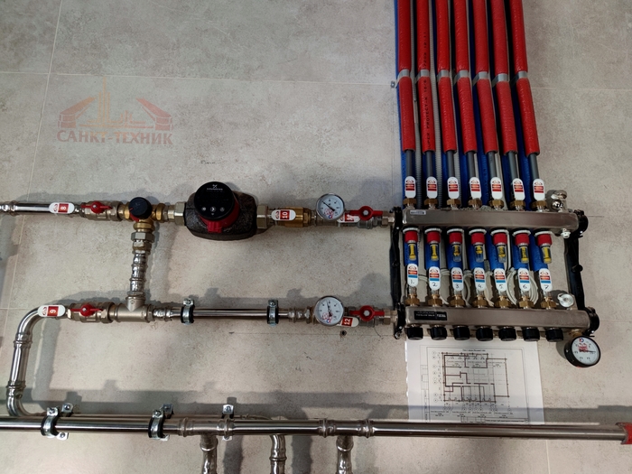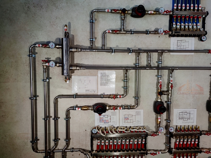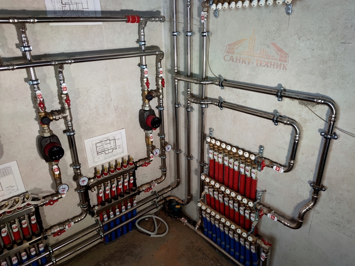 Из отопления здесь только одна система - 400 метров теплых полов (две квартиры по 200 метров). И всё. Я и Слава упорно пытались донести, что на каждую квартиру 100% хватит одной насосной группы с насосом 25-80. Но Никита с Юрием упорно хотели перестраховаться и поиметь на каждый из своих этажей по отдельному потрясающему частотному насосу GRUNDFOS ALPHA2 25-60.