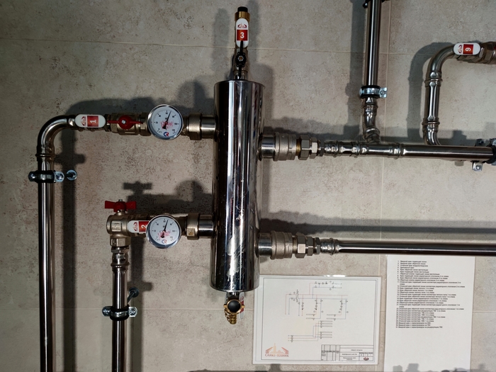 Теплоноситель из основной котельной поступает в гидравлический разделитель, откуда каждый насос забирает нужное его количество для своих нужд. Роль коллекторной балки играет нержавеющая труба 28 диаметра.