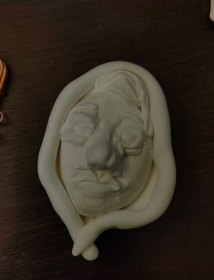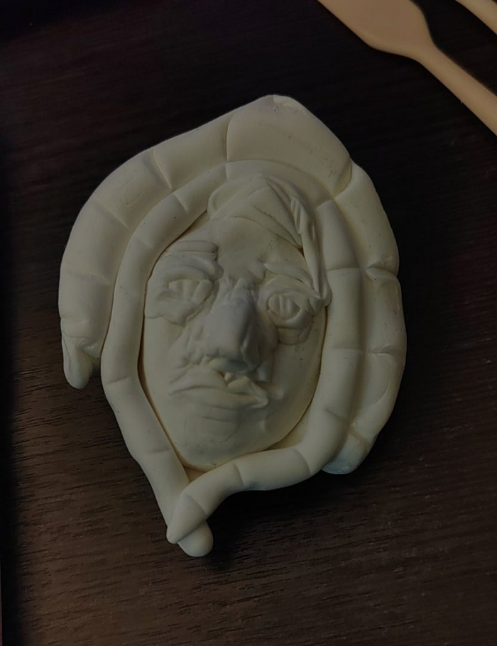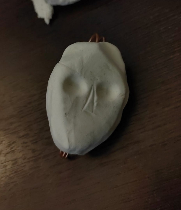 Был создан блинчик-овальчик, на котором пластиковым стеком из детского отдела удалось наметить глаза и треугольник носа. Скульптор лиц из меня так себе, привыкла делать все же более экстравагантные рожи в виде птичьих клювов и мышиных мордашек, а человека делаю впервые.