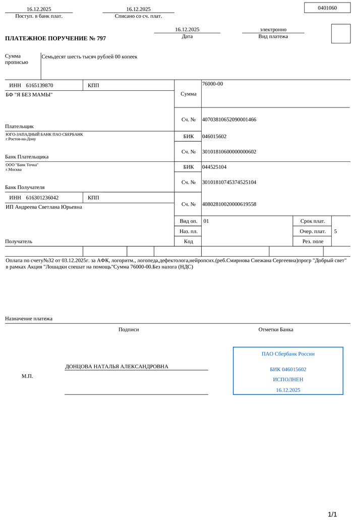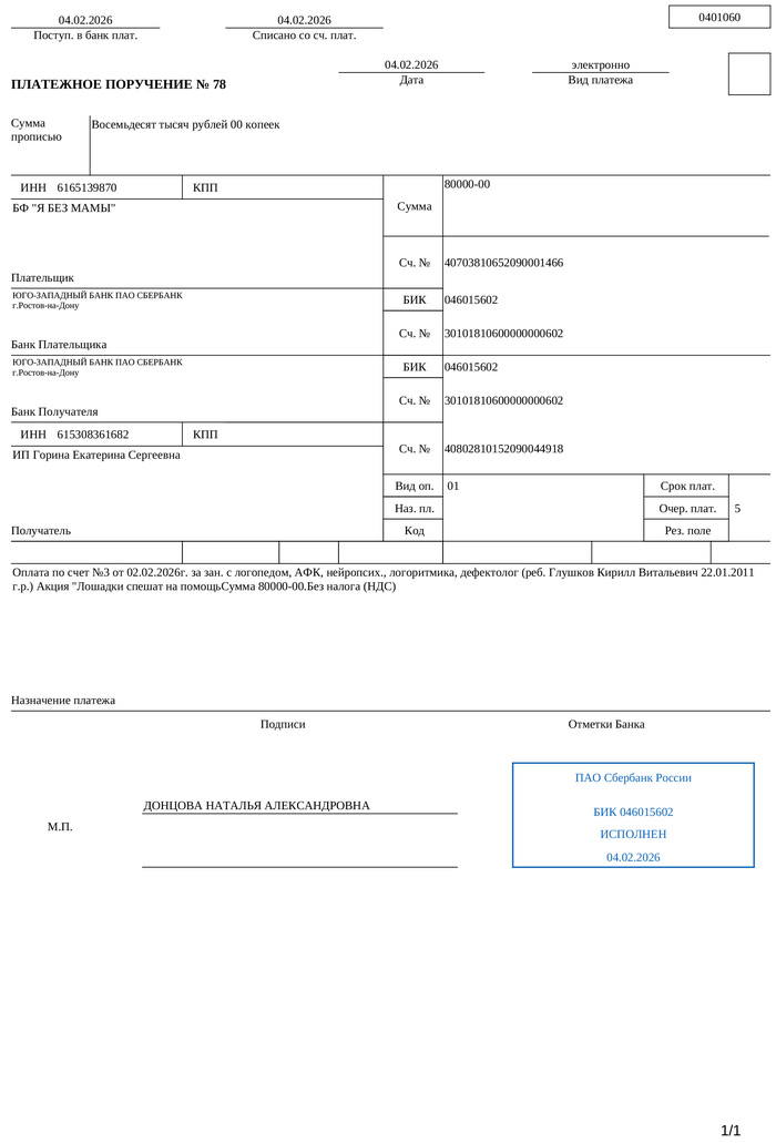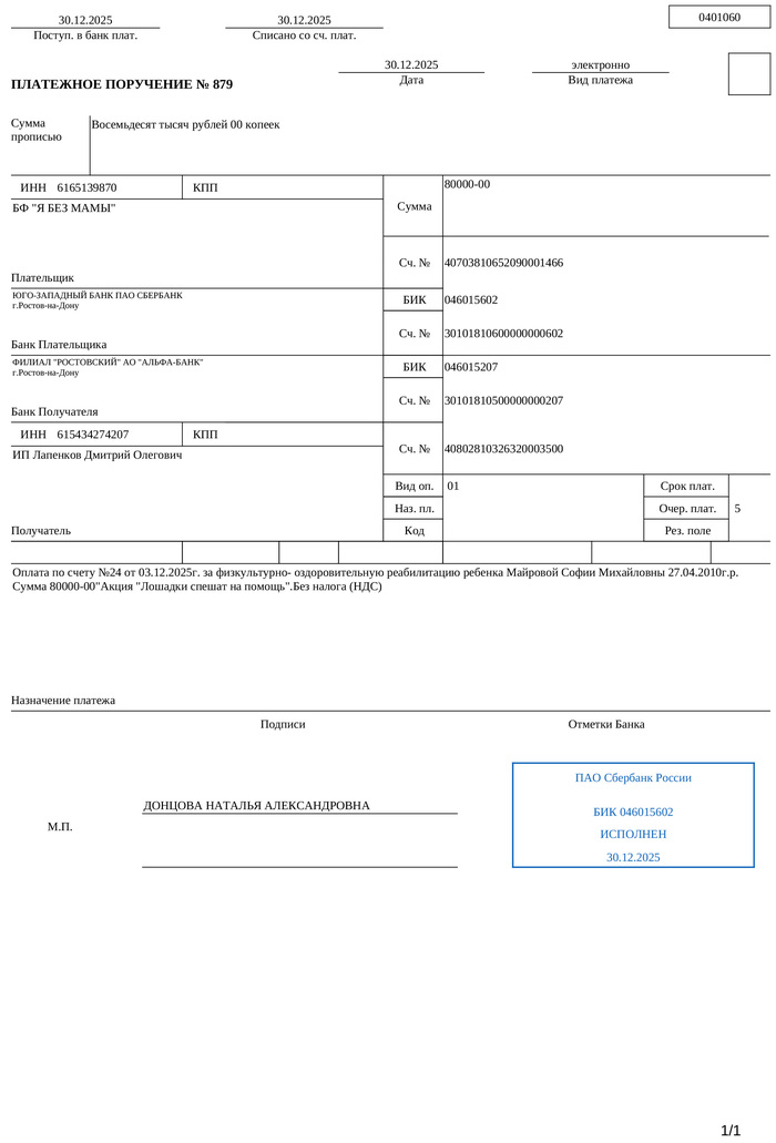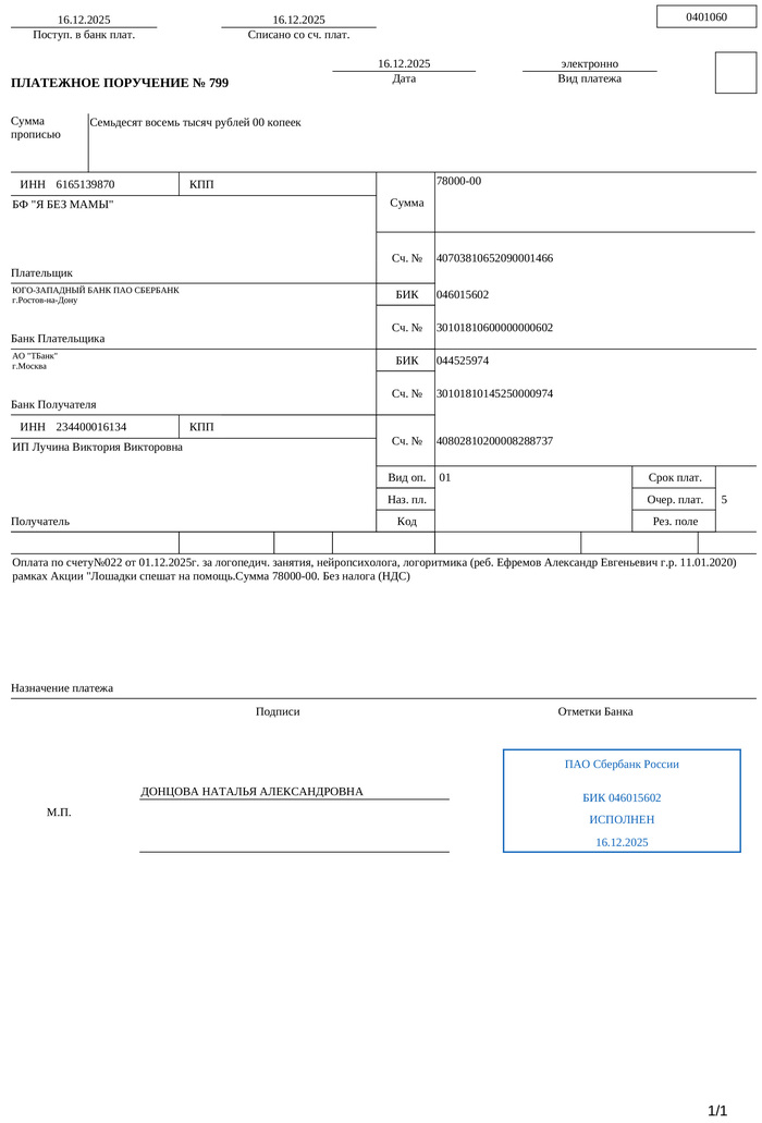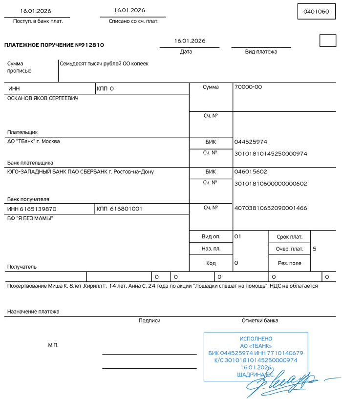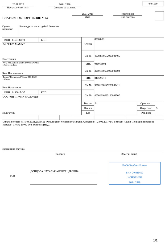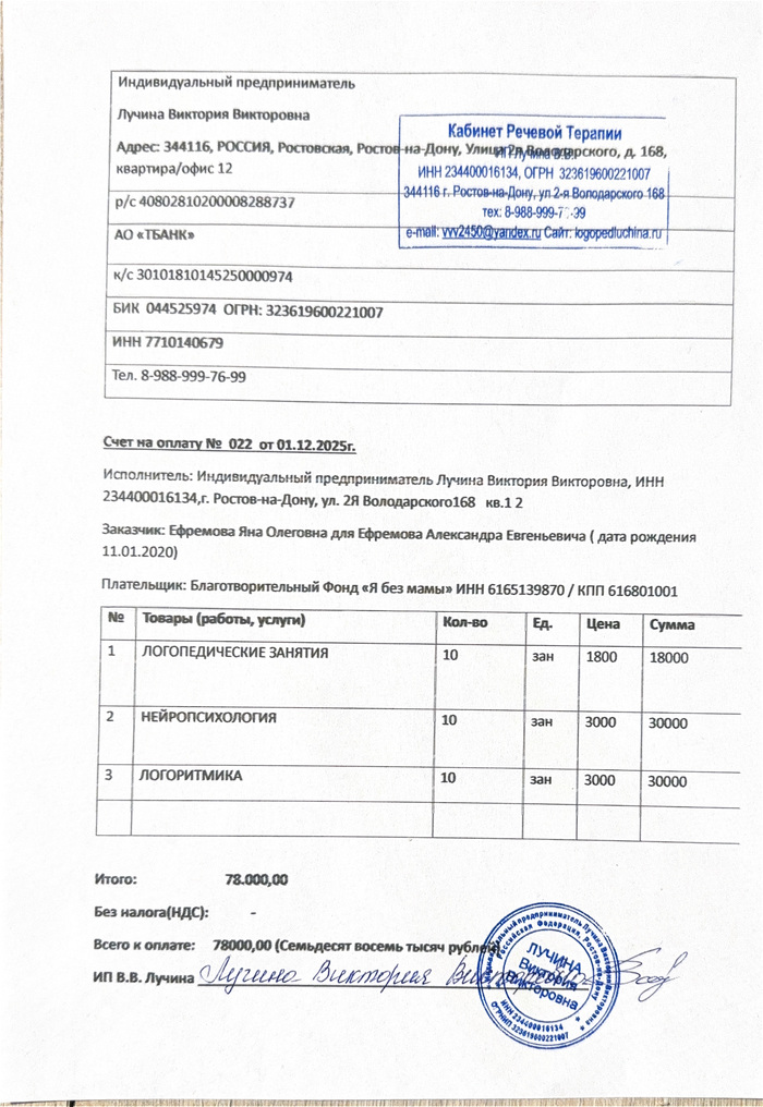 Счёт и платёжка за ребёнка в реабилитационный центр прилагается. Из полной суммы наших тут 25 000 (наши платёжки я собрал в одну карусель выше)