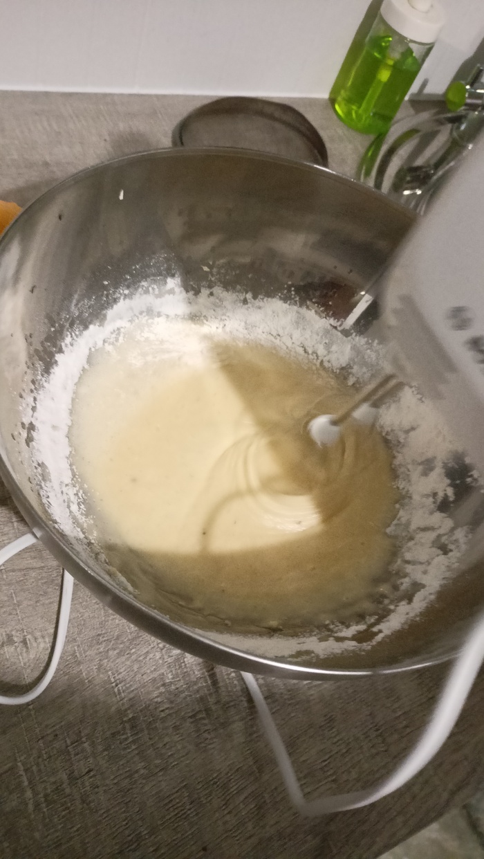 После этого уменьшаем скорость миксера до минимума и потихоньку в несколько приемов вводим мучную смесь. То бишь насыпали маленько- перемешали, ещё насыпали..и так до конца