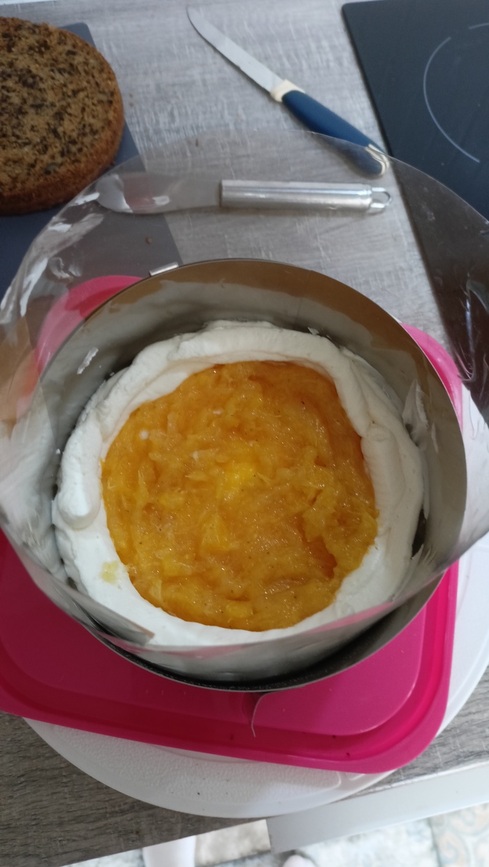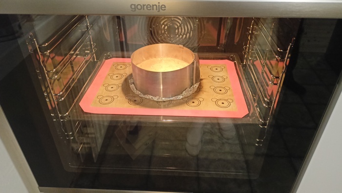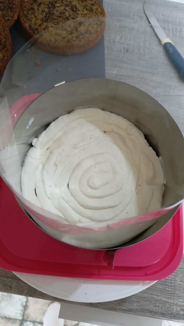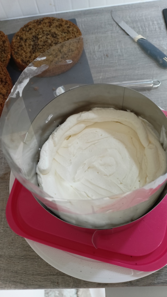 Я собираю в кольце, его надставляю ацетатной пленкой. Именно в такой конфигурации по-другому собрать, думаю, не получится - торт очень высокий, так что не слишком устойчивый.