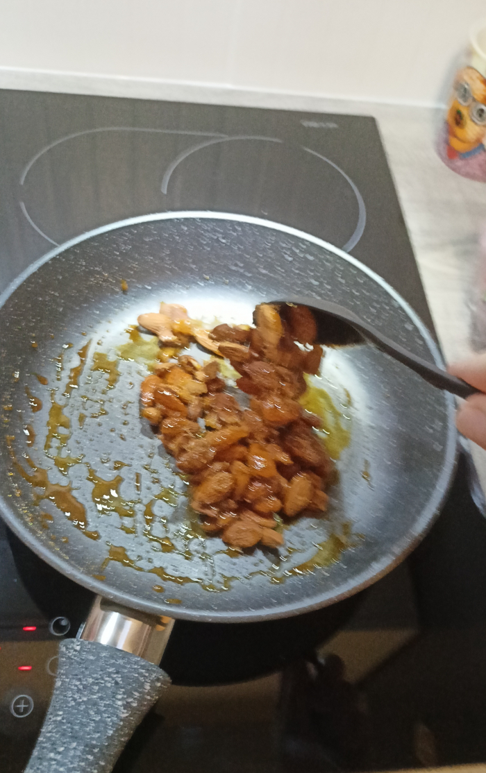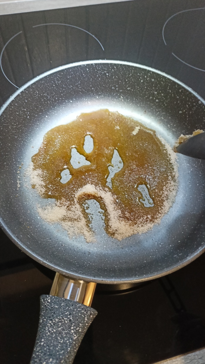 Потом их со сковороды убираем и закидывает туда сахар. Ждём, пока начнет плавиться, потом немножко помогаем лопаткой