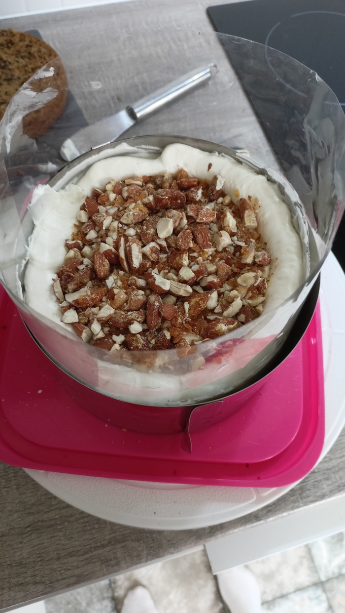 Дальше кладу ещё один корж, так же равномерно покрываю кремом, скраю добавляю бортик, внутрь выкладываю грильяж (сколько влезет)