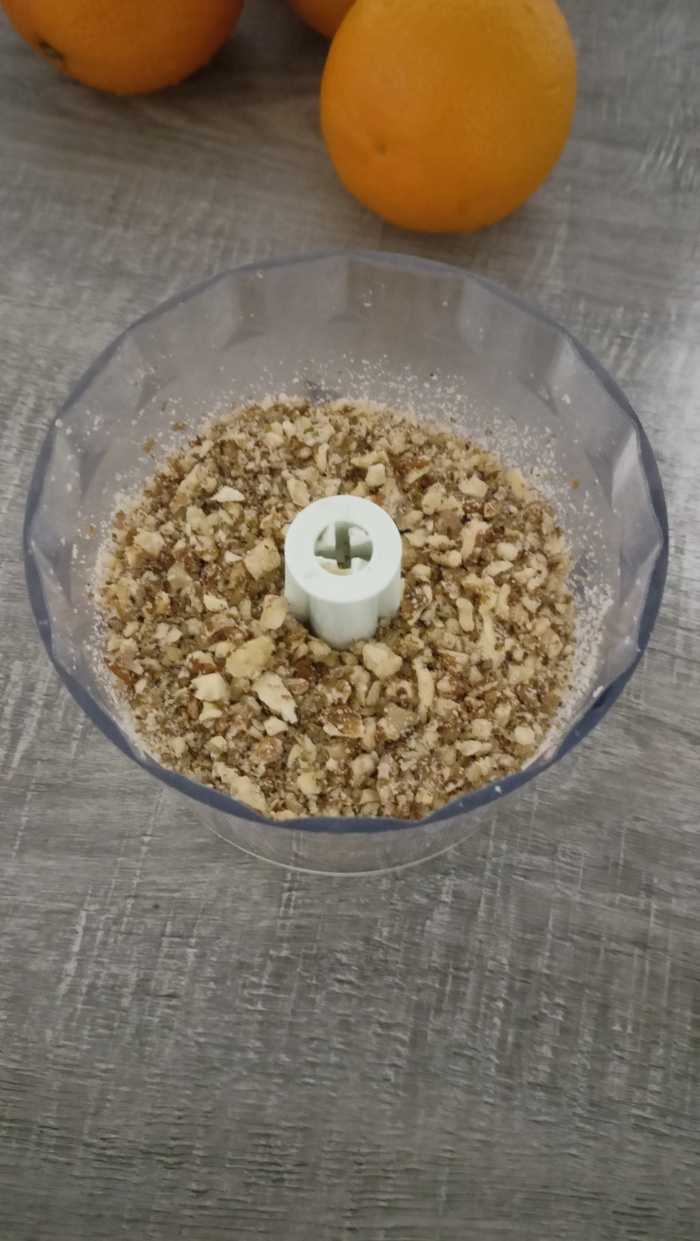 Грецкие орехи дробим любым удобным способом (можно размять скалкой, можно порезать, я перебиваю блендером). Советую не измельчать в пыль, лучше пусть попадаются кусочки покрупнее. Если будете перебивать блендером, советую бить импульсами - нажали, отпустили, нажали, отпустили..и так до нужного результата