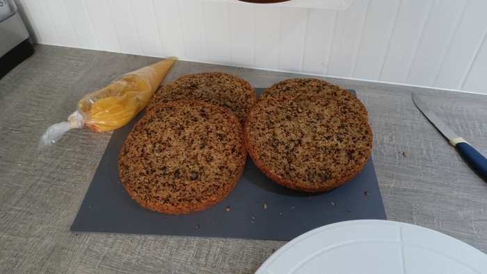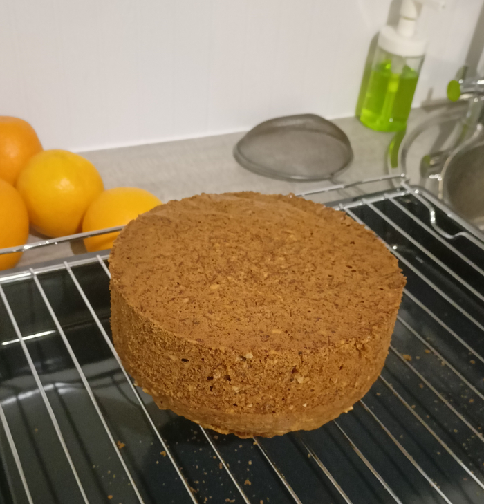 Во все прошлые разы я просто давала коржу остыть при комнатной температуре, потом резала и собирала торт. Но в этот раз во-первых, был уже вечер, и мне не хотелось ждать, во-вторых, это была первая проба духовки и я малость пересушила корж. Так что завернула в пленку и убрала остывать до утра в надежде, что он станет помягче. В принципе так и получилось.