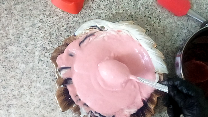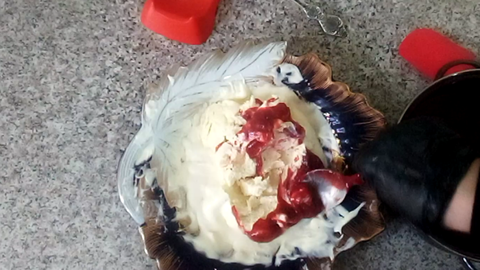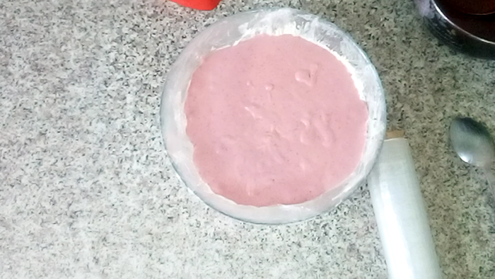 5. Достаем из морозильной камеры мороженое в куполообразной чаше. Добавляем клубничное мороженое в чашу. Выравниваем, закрываем пищевой пленкой и ставим на заморозку.