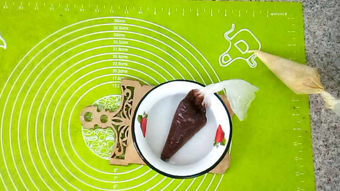 10. Шоколад кладем в кондитерский мешок. Кондитерский мешок помещаем в чашку с горячей водой. Ждем, когда шоколад растает.