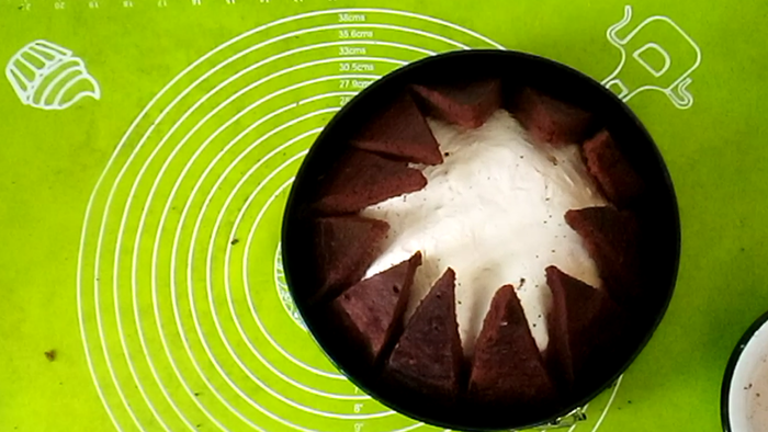 8. Достаем из морозильника мороженое. Чашу с мороженым оборачиваем горячим полотенцем. Переворачиваем чашу и устанавливаем мороженое по середине коржа, который находится в форме. Бисквитные треугольники смачиваем нижним, тупым концом в сахарном сиропе. Приклеиваем их к нижнему коржу, устанавливаем вокруг мороженого.