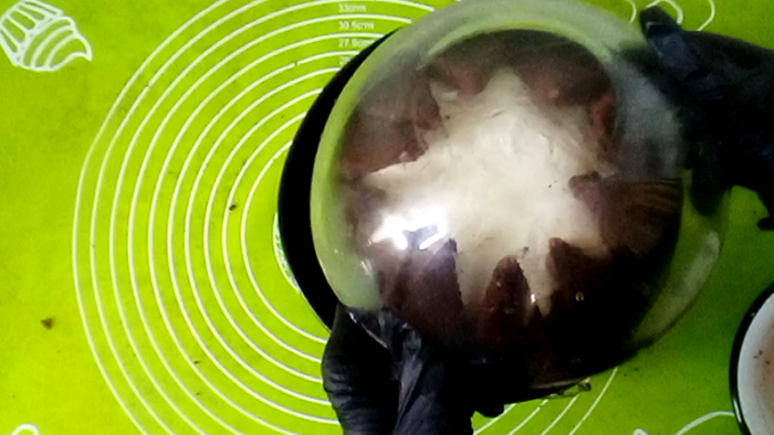 1.Нам нужна куполообразная чаша. Мороженое должно быть в мягком состоянии. 2/3 мороженого выкладываем в куполообразную чашу, выравниваем, закрываем пищевой пленкой. Обе чаши отправляем в морозильную камеру.