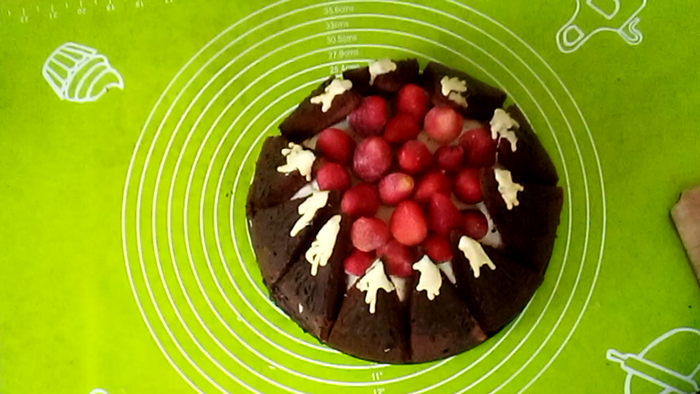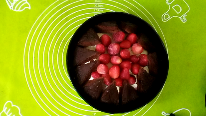 11. Достаем торт. У кондитерского мешка отрезаем кончик. По всей длине зубцов делаем неровные потеки горьким шоколадом. Середину торта украшаем клубникой. Снимаем с торта кондитерское кольцо. Место соединения нижнего коржа и зубцов промазываем горьким шоколадом.
