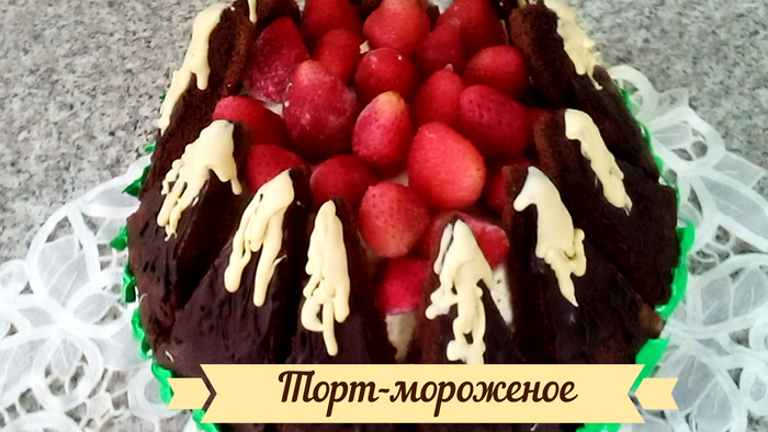 Торт- мороженое - это десерт, который сочетает в себе несколько видов любимых лакомств. Первое - это шоколадный торт, второе и третье - два вида мороженого. В торте используется 2 вида мороженого - мороженое ванильный пломбир и мороженое пломбир клубничный. За основу торта мы взяли шоколадный шифоновый бисквит. В состав шифонового бисквита входит растительное масло.Поскольку растительное масло не отвердевает даже при низких температурах, шифоновый бисквит не твердеет и не промерзает при низких температурах. Благодаря этому свойству шифоновый бисквит лучше других подходит для кондитерских изделий с охлаждёнными или замороженными начинками, такими как мороженое или взбитые сливки. Торт декорирован клубникой, черным горьким и белым шоколадом. Сочетание насыщенного шоколадного вкуса бисквита, сливочного пломбира и аромата и вкуса клубничного пломбира доставит вам истинное удовольствие. Наслаждайтесь вкусом! Давайте приготовим этот замечательный десерт!