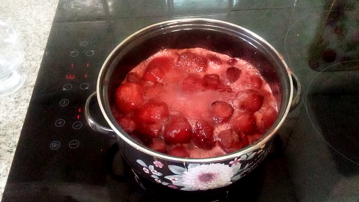2. Варим клубничный джем. Кастрюлю с клубникой ставим на плиту. Когда появится сок, отливаем 1/3-1/2 стакана. В клубнику добавляем сахар и варим до готовности. Сок охлаждаем.