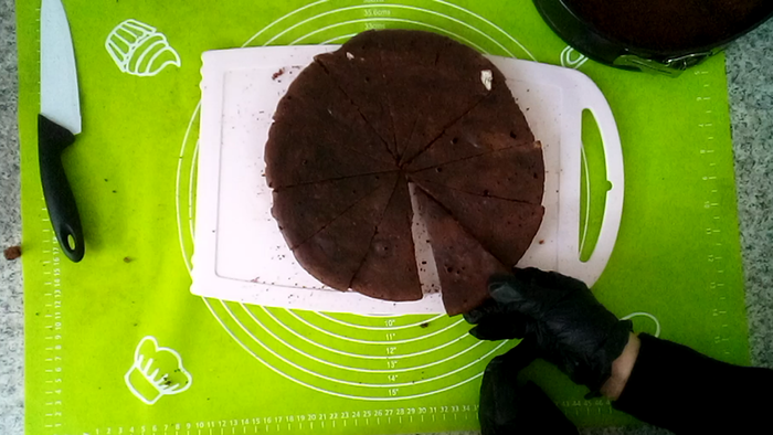 6. Бисквит разрезаем на 2 коржа. Пропитывать бисквит не надо! Один корж кладем на дно разъемной формы. Второй бисквит разрезаем на 12 сегментов.