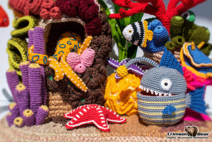 Размер основания композиции 28х20 см., высота 33 см. Длина осьминога с щупальцами 14 см. Маленькие рыбки по 4 см. Моллюск хромодорис 8 см. в длину. Кораллы выполнены из пряжи с проволочным каркасом. Основание композиции и камни выполнены с применением гофрокаркаса. Изделие относится больше к сувенирной категории, но отдельные элементы, в частности представители морской фауны по отдельности могут служить как игрушки для детей от 3х лет.