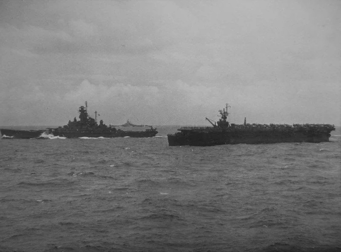 «Алабама» с авианосцем «Коупенс» во время сражения в заливе Лейте в октябре 1944. На заднем плане — линкор «Саут Дакота».