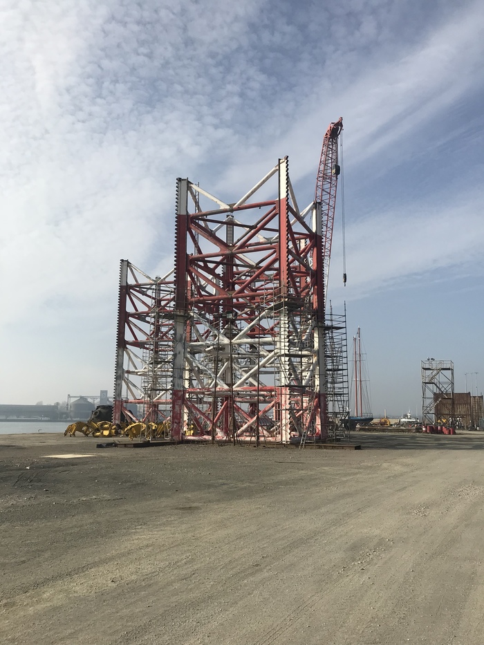 Эта процедура называется "Постановка на точку". После перегона установки, ее ставят возле блок-кондукторе и проверяют правильность постановки и возможность дотянутся буровой вышкой (кантеливером) до нужных скважин. На фото СПБУ перед подъемом на рабочую высоту для бурения скважины на блок-кондукторе. В данный момент СПБУ стоит на минимальном воздушном зазоре в 2 метра для задавки опорных колонн в грунт дна моря.