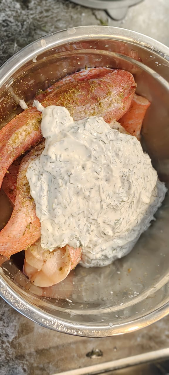 Морской окунь (тушки без головы), спагетти, сметана, сливки, сыр тёртый, сметана, укроп, лимон. Лимонграсс. Соль, перец. На фото ещё есть зернистая горчица, но я передумал её использовать. А вот чеснок забыл положить :(