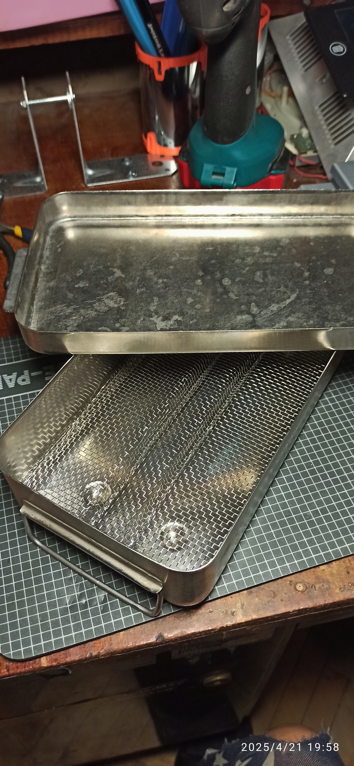 Был приобретен стерилизатор для шприцев за 400 руб. Как раз туда влезет один морской окунь. Ну и понадобилась на дно решетка. Заказал на Али сетку из нержавейки, еще 300 руб, и выгнул.